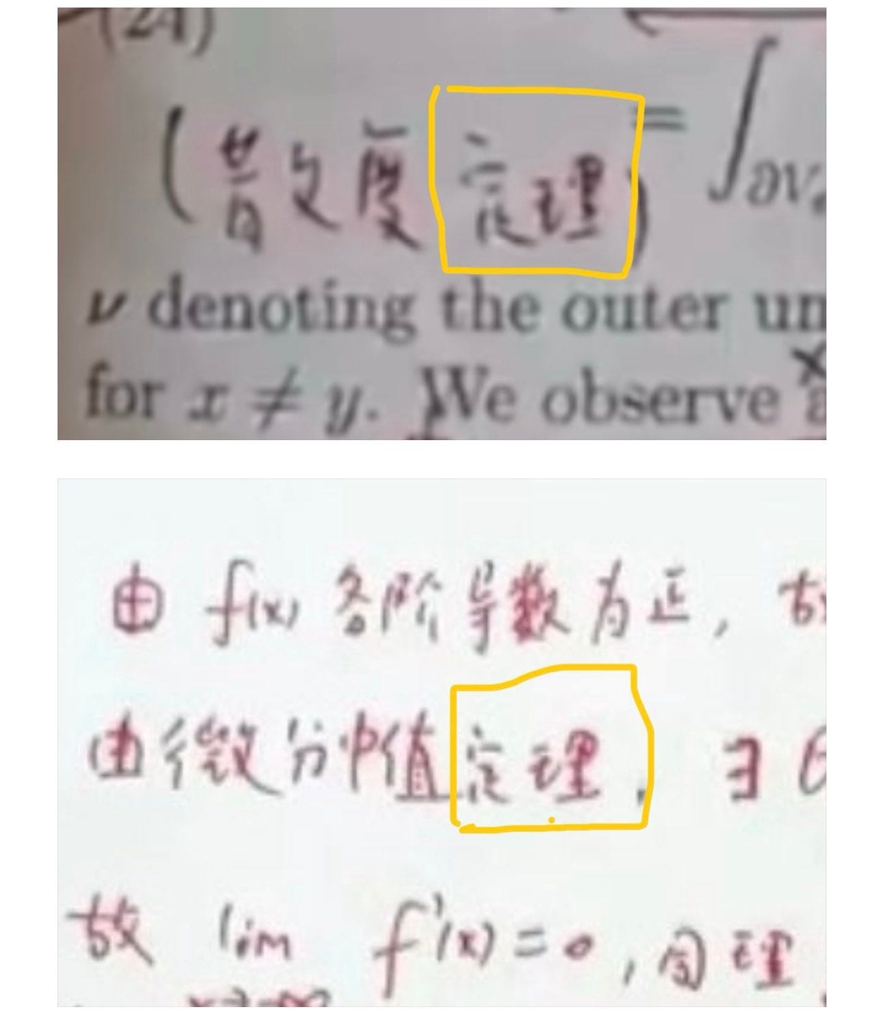 达摩院为了宣传姜萍,还拍了她声称平时边查《英汉小词典》边看的那本英文《偏微分方程》,上面也有红笔写的中文注释。注释里有一个词“定理”,媒体晒出的王闰秋的笔记里刚好也有“定理”,两个“定理”放在一起就可以看出是同一个人写的,证明那本《偏微分方程》不是姜萍的,而是她老师王闰秋给她作道具的。所以,达摩院晒出来宣传姜萍、证明她平时就在自学高等数学的视频,反而证明了都是假的。姜萍这个数学白痴冒充数学天才,证据太确凿,已经没有什么疑问了。