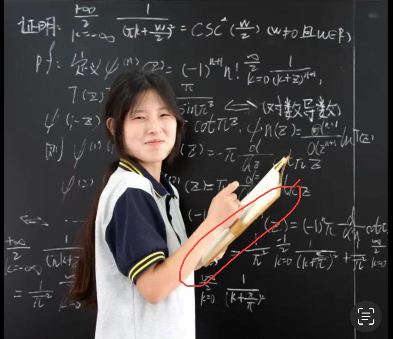 我以前提到,姜萍往黑板上抄板书时,手上拿的笔记本是她老师王闰秋的。有什么证据呢?达摩院为了证明姜萍平时就在自学高等数学,说那个笔记本就是她学高等数学的笔记,还拍了里面的内容,但笔记本上的字是用红笔写的。一般是老师才会用红笔做笔记,学生不会用红笔做笔记,因为老师要用红笔批改学生的作业,所以有的老师就习惯用红笔来做笔记,王闰秋就是这样。王闰秋现在也出名了,他的母校江苏大学给媒体提供了一张王闰秋数学笔记的手迹,从上面可以看出他的确是用红笔做笔记,而且字体跟姜萍拿在手上的笔记本里的一样,这就证明笔记本是王闰秋的。