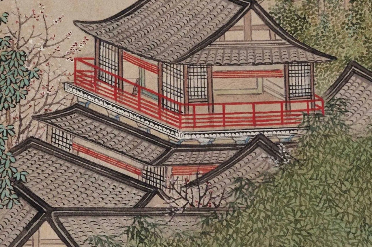 民国著名画家马晋在1922年曾经去庞元济家临摹过这幅《江南春图》,他就把原画没有的斗拱都给清清楚楚地画出来了。他肯定临摹过很多画,知道有斗拱这种结构,说不定一边临摹《江南春图》,一边心里在嘀咕,仇英怎么不知道斗拱,在那里乱画呢。