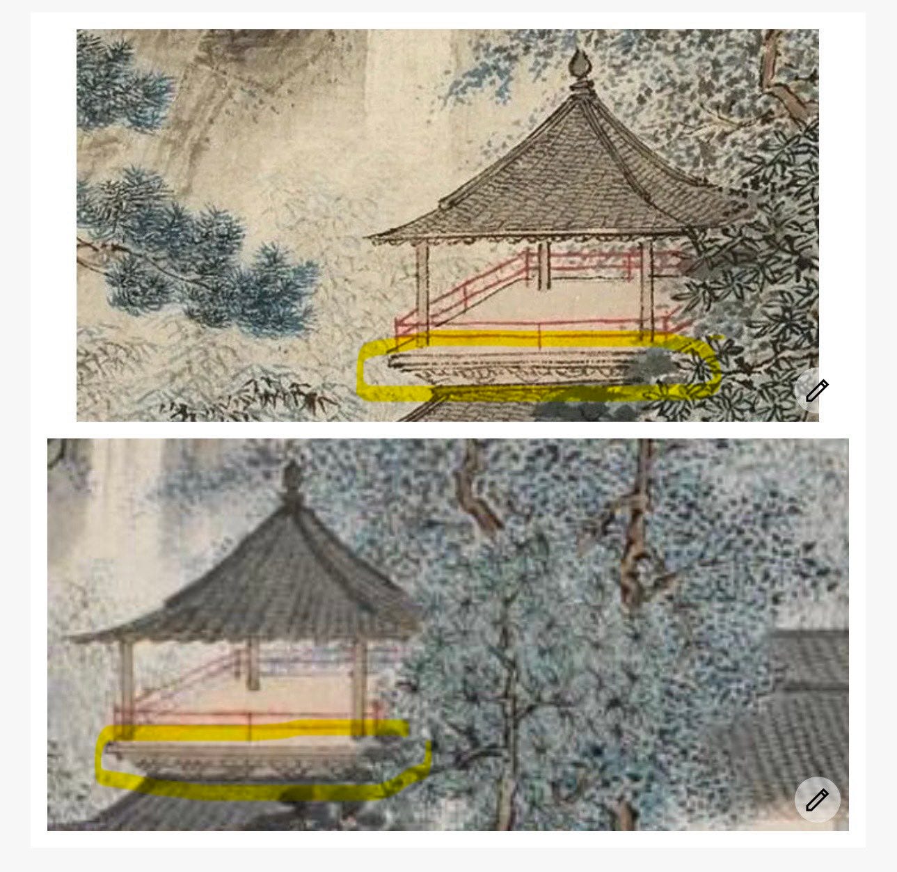 我再举一个例子好了。中国古代建筑在两层楼之间有一个特殊的结构,叫斗拱。它起到了加固支撑的作用,也起到了装饰的作用。我们看《春游图》,两层之间有很清楚的斗拱结构。《江南春图》画了同一个建筑,两层楼之间是乱画的,根本不是斗拱,就一串圆圈,都不知道画的什么。