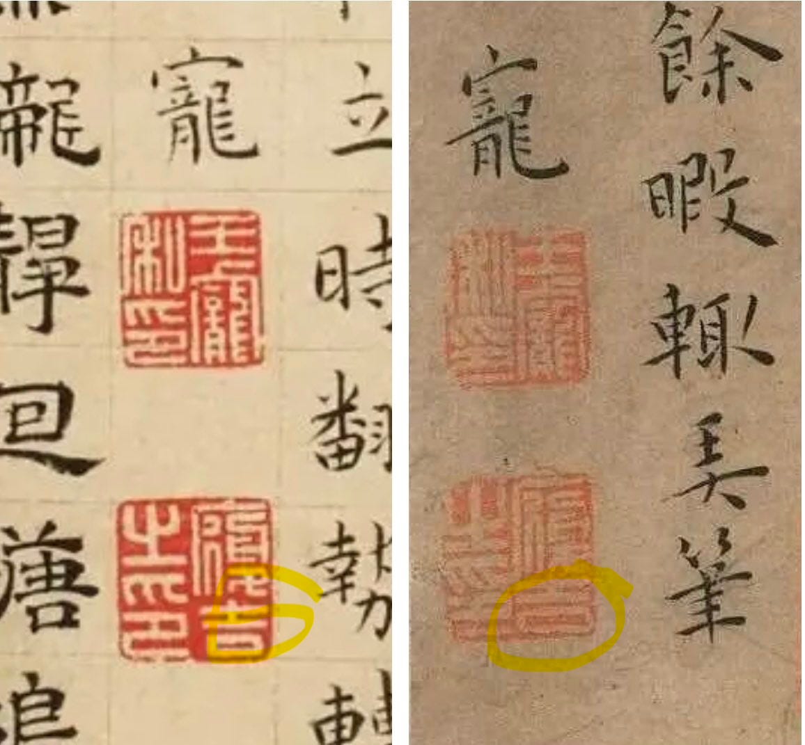 汤哲明认为,后面那些跋有可能是真的。但是那些跋不可能是真的。后边的跋排在第一个的是王宠,它们都写在同一张纸上,所以只要王宠是假的,后面那些肯定都是假的。我们只要去比对王宠的章,就可以看出来是假的。我上次说过了,看那个“吉”字,真章下面的“口”比较大,南博本的王宠的章的“口”明显小多了,所以是假章。王宠的题跋是假的,后面那些跋都在同一张纸上,当然都是假的了。所以确切无疑地,南博本《江南春图》肯定是假的,不可能像汤教授说的里面有真有假。