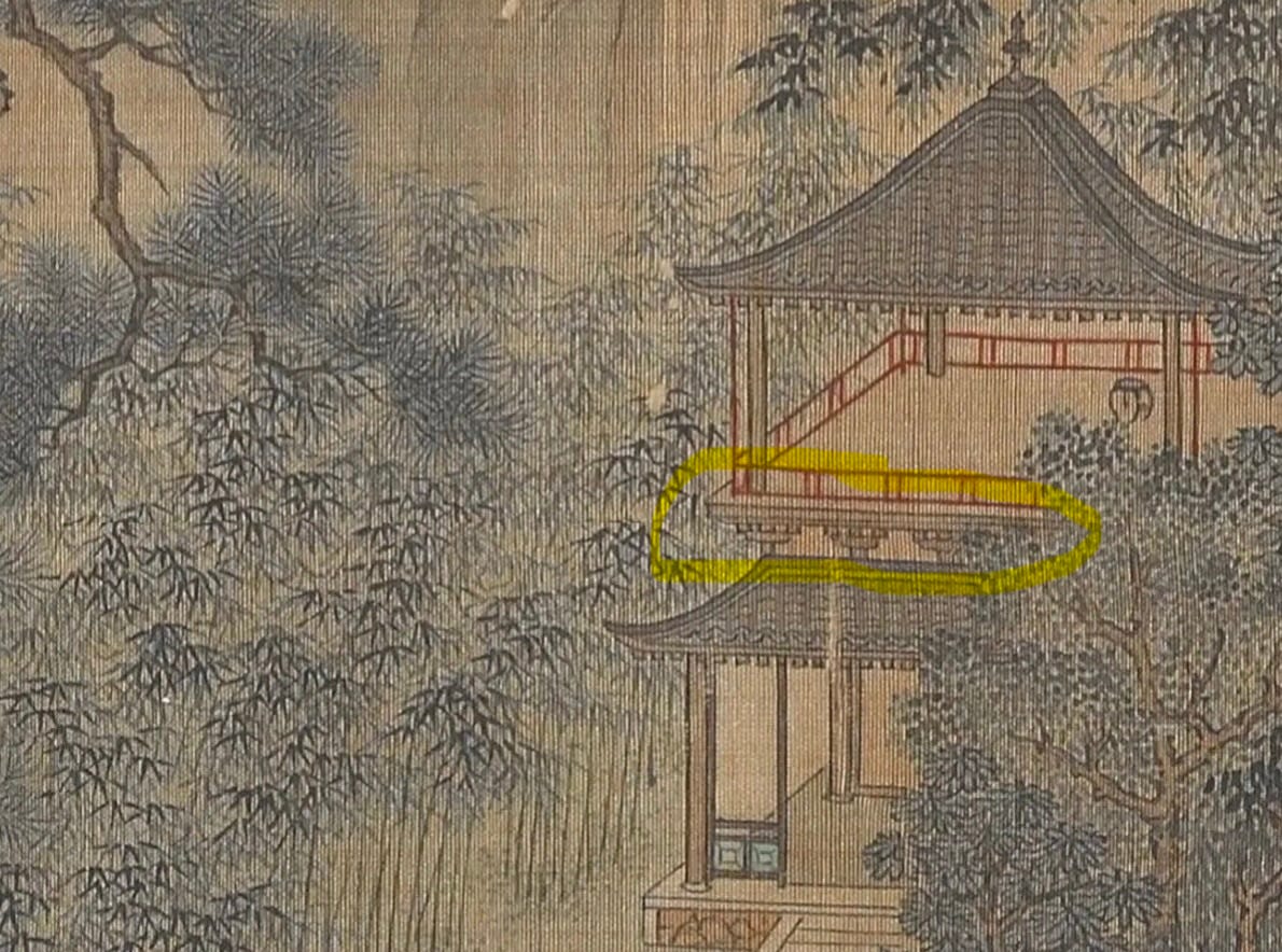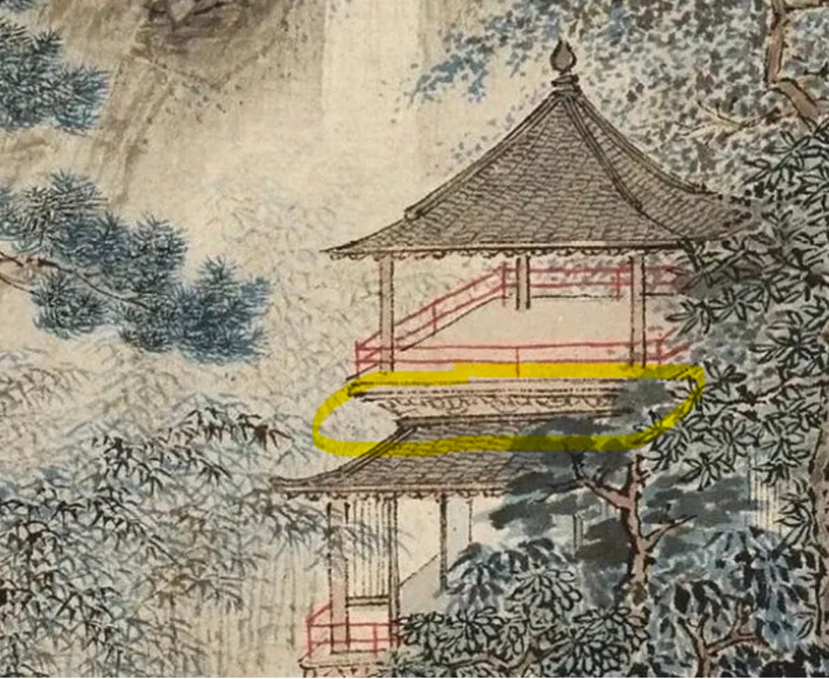 难道是因为仇英不知道斗拱吗?不是的,看别的被认为是仇英真迹的画,两层楼之间也画了斗拱。只能说明那个临摹的人或者不知道有斗拱,或者虽然知道,但是随便乱画。这怎么能够说明该画的水平高,只有仇英能够画出来?